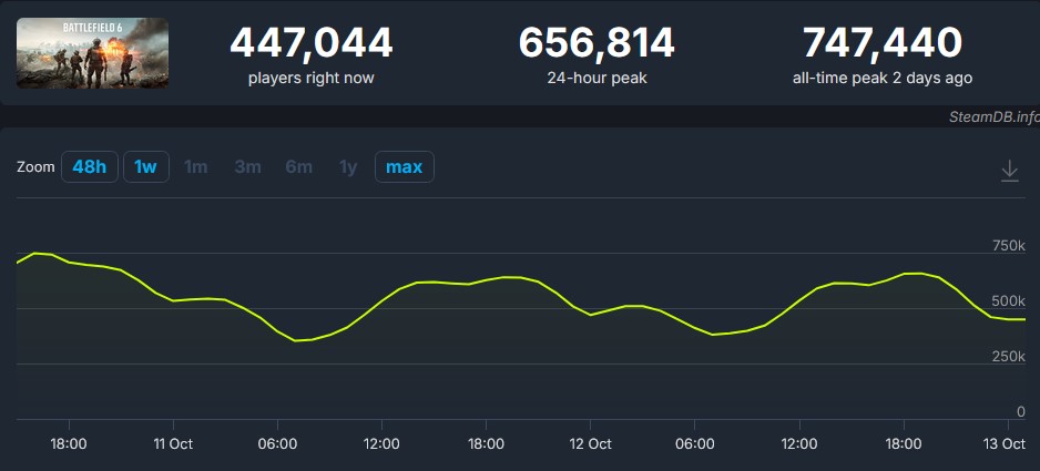 Meski begitu, kabar baiknya, waktu tunggu untuk masuk ke game nggak terlalu lama. Berdasarkan data dari SteamDB, jumlah pemain aktif Battlefield 6 sempat menembus 747.440 orang tak lama setelah rilis, dan masih stabil di atas 400 ribu ketika artikel ini ditulis. Angka ini jauh melampaui jumlah pemain saat beta, jadi jelas kalau banyak yang udah nungguin game ini sejak lama.