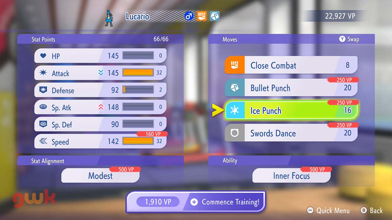 - Mengatur EV: 5 VP per poin stat; 160 VP untuk memaksimalkan satu stat (32 poin)