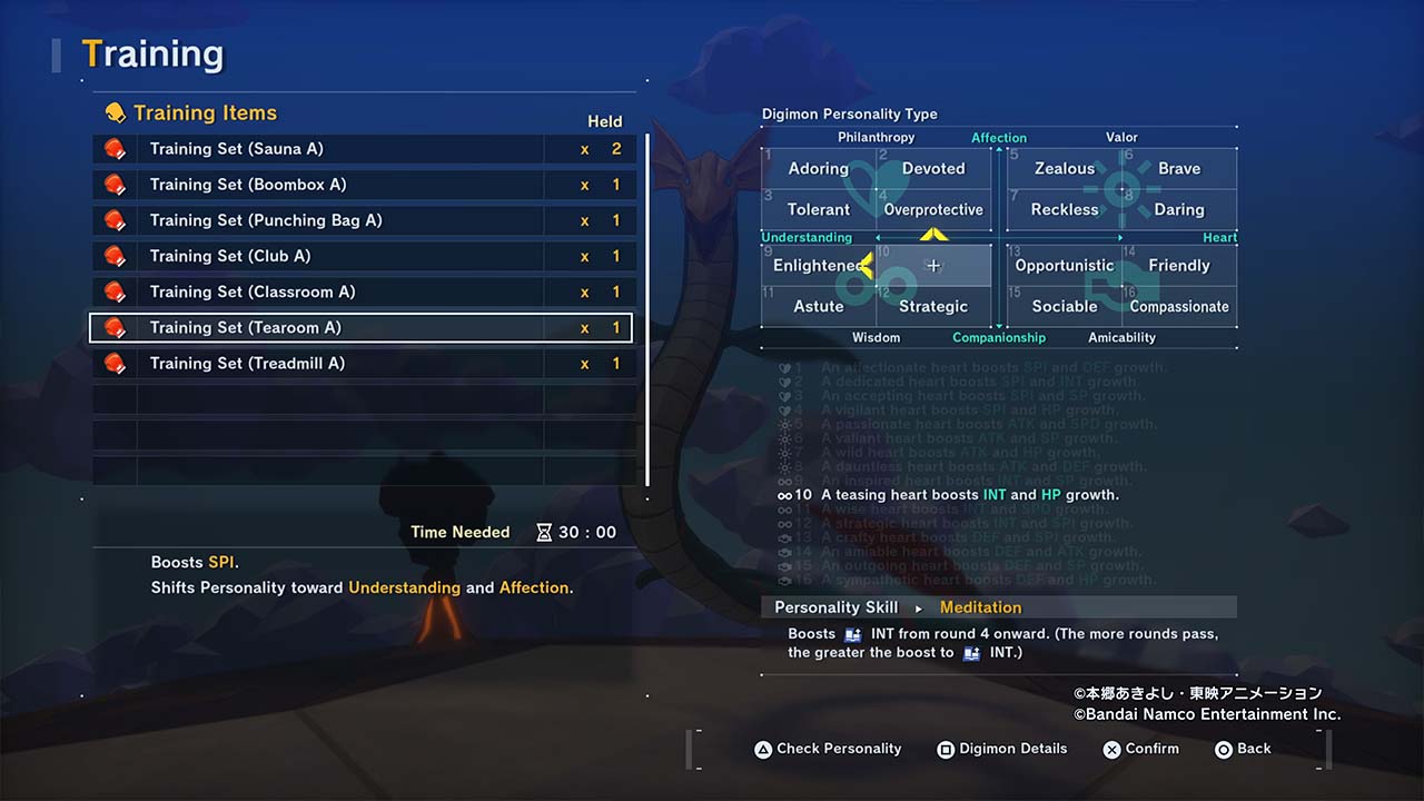 Opsi lainnya adalah lewat Digifarm yang bisa kamu akses di In-Between Theater yang dijaga Mirei Mikagura. Selain sebagai tempat untuk melatih dan menyimpan Digimon, kamu bisa memberi mereka set item yang tidak hanya berguna untuk meningkatkan stats, tapi juga ikut mendorong transisi ke Personality baru. Kebetulan dari sini kamu bisa melihat fase transisi dengan lebih jelas lewat simbol panah berwarna kuning, jadi tidak ada salahnya untuk membawa Digimon aktifmu ke Digifarm jika ingin memastikan status Personality yang lebih jelas. Setiap sesi training memakan waktu selama 30 menit penuh, jadi kamu memang harus lebih sabar dibanding dengan mencoba opsi pertama lewat menjalani pertempuran dan berinteraksi langsung dengan Digimon.