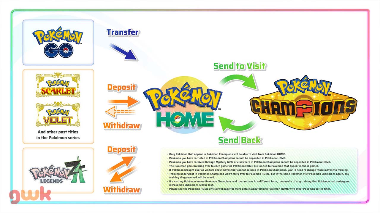 Batasan transfer: Pokémon yang direkrut langsung di Champions tidak bisa dikirim kembali ke Pokémon Home. Hanya Pokémon yang diimpor dari Home yang bisa ditransfer bolak-balik.
