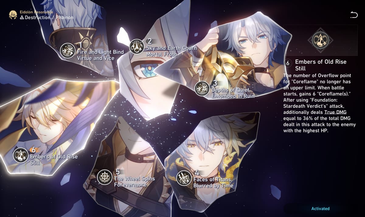 Buat Eidolon, E2 jadi sweet spot karena naikin Physical RES PEN dan nambah Extra Turn tiap pakai skill andalannya. Kalau budget terbatas, fokus aja ke Light Cone signature ketimbang kejar E1. Kombo terbaik bisa E0 + S1 (2 gold) atau kalau mau maksimal, E2 + Light Cone (3 gold).