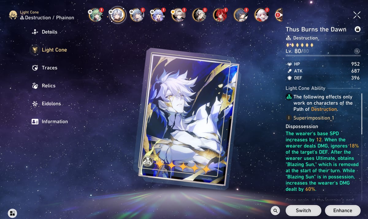 Light Cone signature-nya, “Thus Burns the Dawn”, wajib banget. Nambah SPD, ignore DEF musuh, dan boost DMG sampai 60% habis pakai Ultimate. Alternatifnya ada “On the Fall of an Aeon” dari Simulated Universe, atau opsi bintang 5 kayak “Brighter Than the Sun”, “The Unreachable Side”, atau “Something Irreplaceable”.