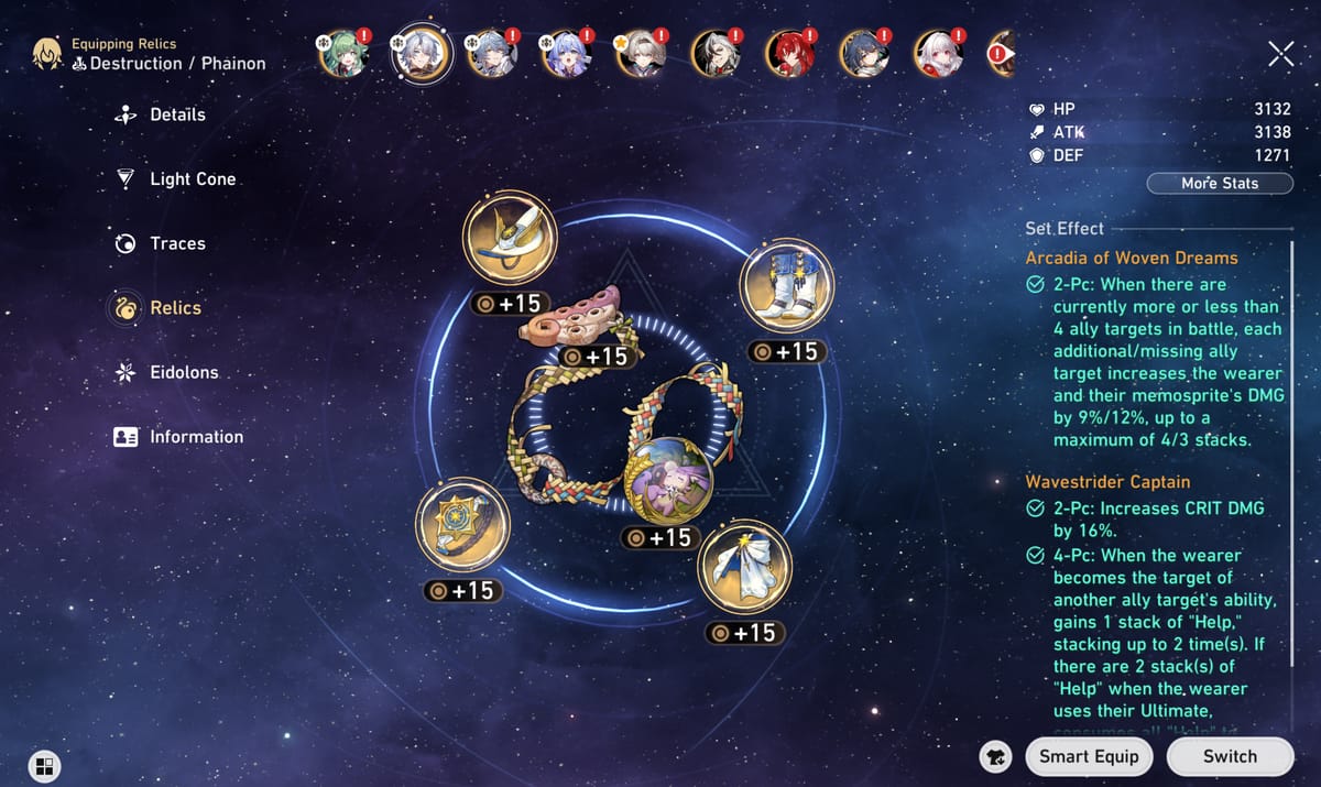Setup tim paling simpel: Phainon + 3 support, atau Phainon + 2 support + 1 sustain. Beberapa support yang cocok di antaranya Tingyun, March 7th, Lynx, Sunday, Robin, Sparkle, Bronya, Luocha, atau Huohuo.