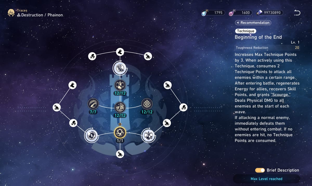 Sesudah transformasi, Basic ATK dan Skill-nya makin brutal. Basic ATK jadi Blast dengan Physical DMG 250% ke target utama dan 75% ke yang di samping. Skill “Calamity: Soulscorch Edict” bikin musuh langsung jalan semua, lalu dia masuk mode Soulscorch yang ngurangin damage masuk 75% sambil nyiapin counter attack super sakit. Skill pamungkasnya, “Foundation: Stardeath Verdict”, bisa ngehapus semua debuff lalu ngeluarin Physical DMG sampai 1170%, ditambah rentetan damage ke musuh random tergantung berapa banyak Scourge yang dikumpulin.