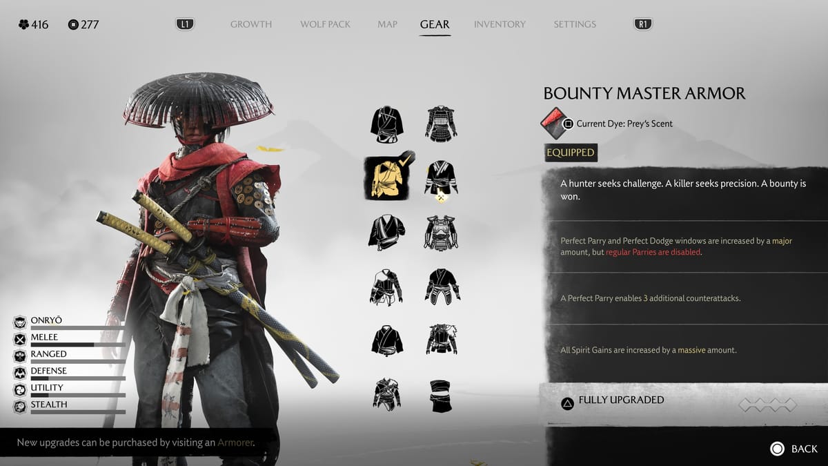Armor legendaris milik arwah pendendam yang dikenal memburu Yōtei Six. Armor ini fokus bikin musuh takut dan buka celah serangan lanjutan yang lebih kuat.