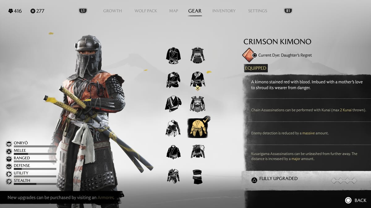 Kimono merah darah yang dipenuhi kutukan cinta seorang ibu untuk melindungi pemakainya dari bahaya. Armor ini lebih fokus ke kemampuan stealth.