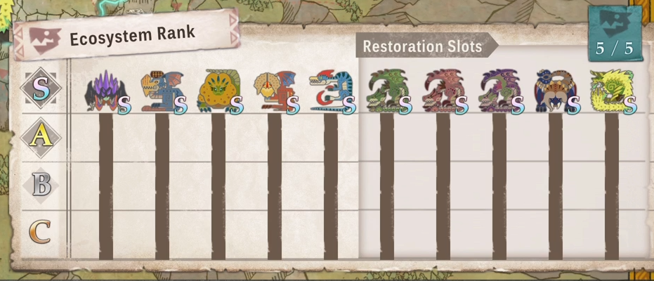 Dengan menempatkan Monstie di sebuah habitat, kamu akan membentuk atau meningkatkan Ecosystem Rank monster tersebut di wilayah tertentu. Setiap monster memiliki peringkat terpisah untuk setiap wilayah yang ditempatinya, bukan satu nilai global. Sebagai contoh, Silverwing Nargacuga mungkin memiliki Rank S di Sunpetal Plains tetapi hanya Rank A di Mirror Lake.