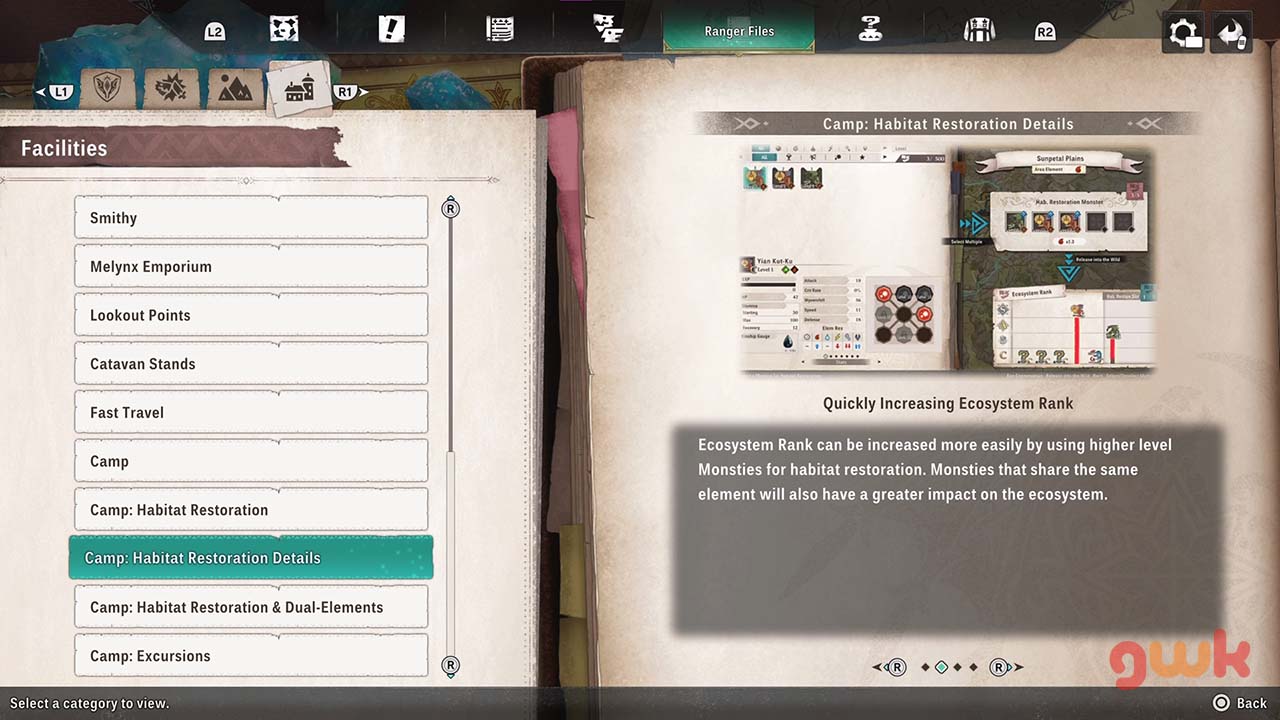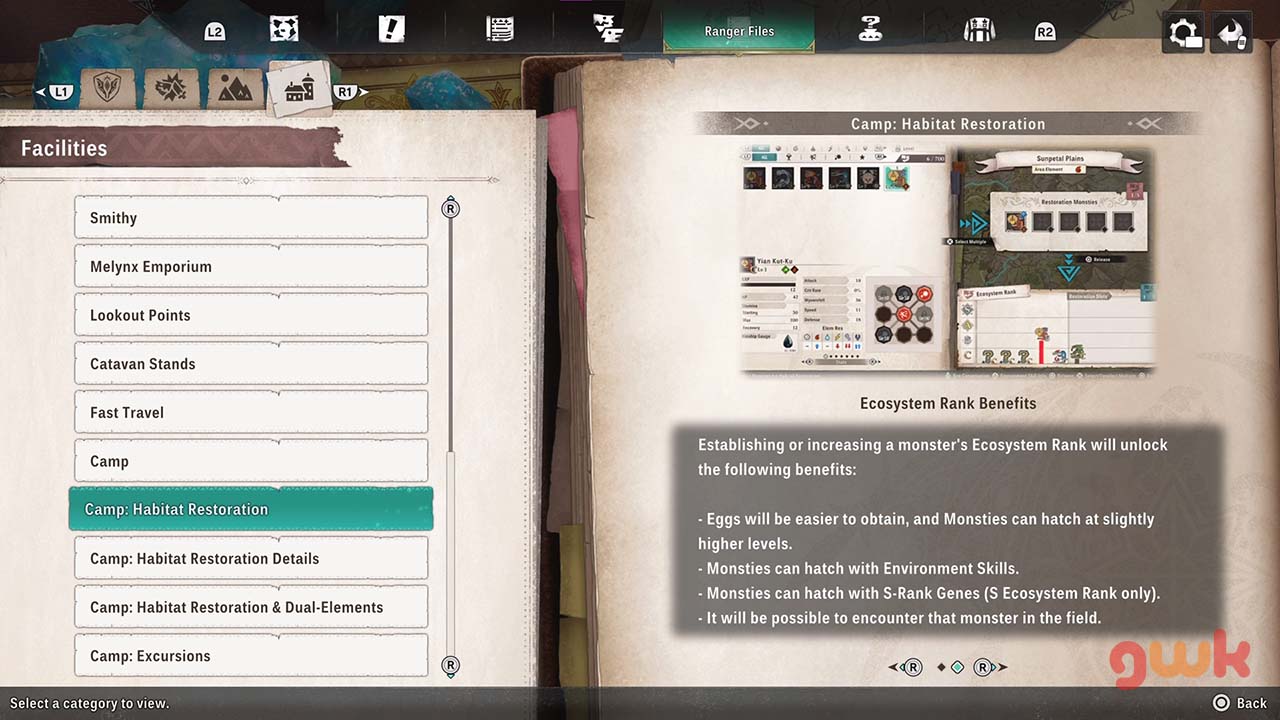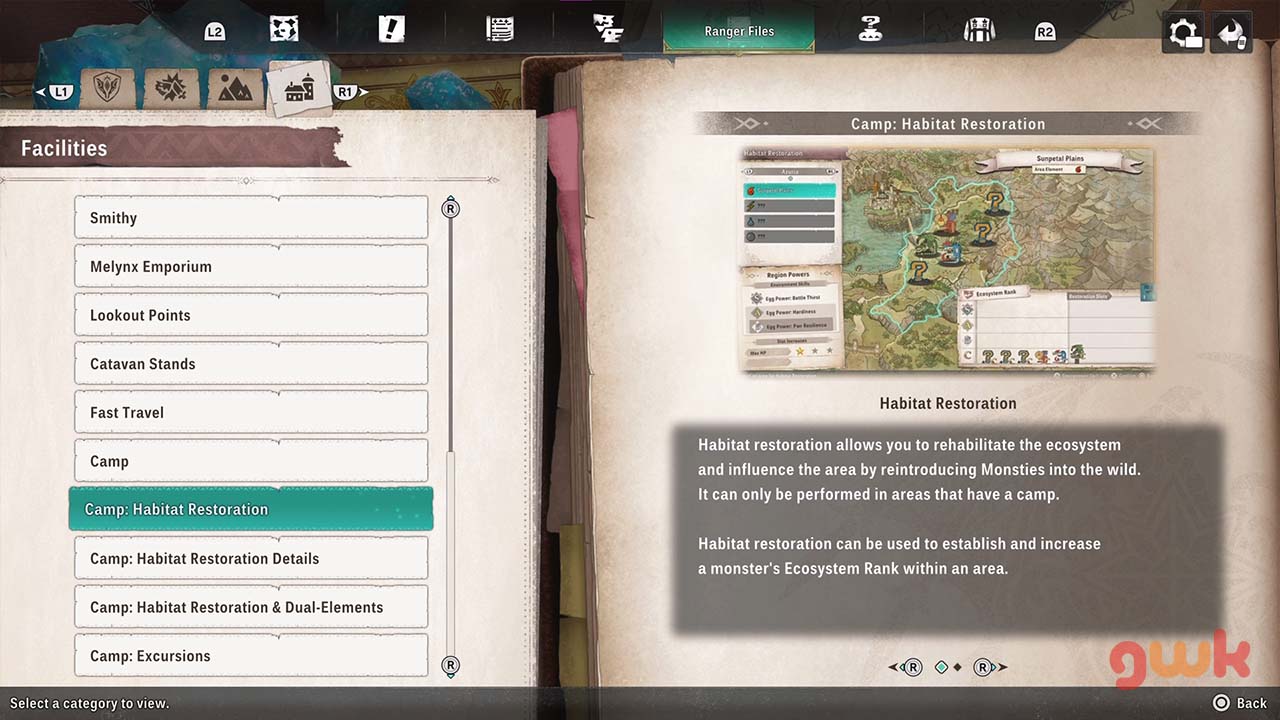 Habitat Restoration memungkinkanmu merehabilitasi ekosistem dengan menempatkan Monstie kembali ke alam liar. Namun, restorasi hanya bisa dilakukan di area yang memiliki camp, yang berfungsi sebagai pusat pengelolaan ekosistem untuk wilayah tersebut.