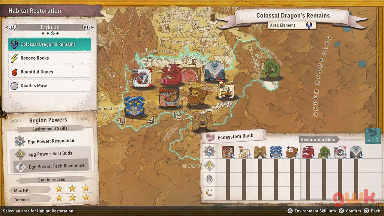 Perlu dicatat bahwa setiap peta memiliki dua Stat Bonus untuk monster: yang pertama tersedia segera, sementara yang kedua hanya terbuka setelah mengalahkan Elder Dragon di peta tersebut. Jumlah bintang (hingga 3) untuk setiap bonus meningkat sesuai dengan keseluruhan Ecosystem Rank dari semua monster di peta tersebut, sehingga penting untuk mengembangkan monster secara merata di berbagai wilayah.