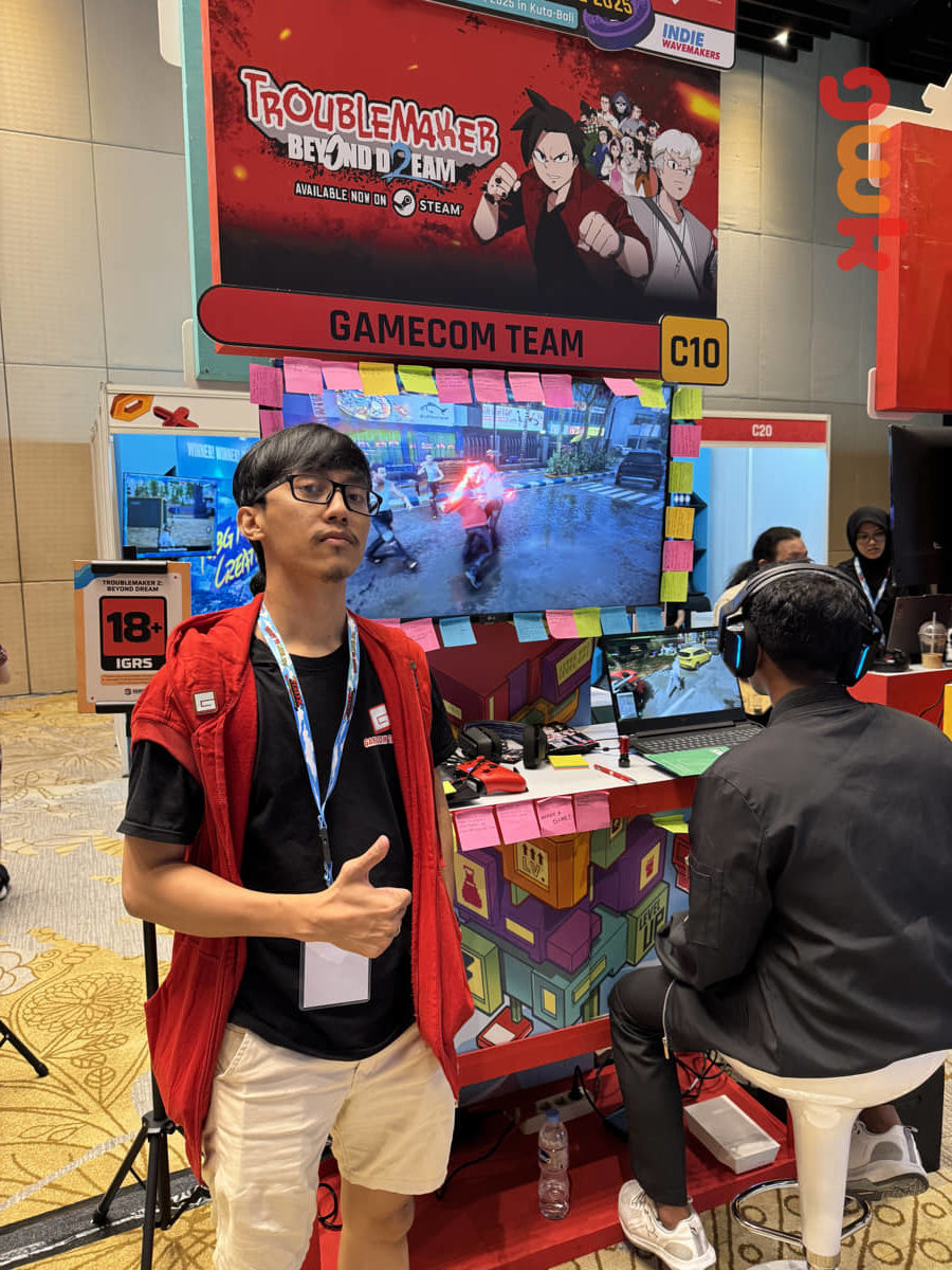 Nama Nanda mungkin sudah tak asing bagi para gamer Indonesia yang mengikuti perkembangan game lokal. Sebagai Game Director, Producer, dan Writer dari Troublemaker Series, sekaligus CEO Gamecom Team Studio, Nanda adalah otak di balik salah satu IP game lokal ini. Ia membuka ceritanya dengan nada santai, “Saya Nanda dari Gamecom Team Studio. Kita berbasis di Jakarta, dan sekarang sudah merilis dua game besar, Troublemaker 1 di tahun 2023, dan baru dua minggu lalu Troublemaker 2 di Steam.”