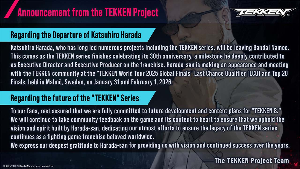 Akun Twitter resmi Tekken ikut berbagi pengumuman resminya sendiri, tertama mengenai nasib franchise diluar tanggung jawab Harada. Pertama mereka memastikan kalau Harada akan tetap menyapa komunitas Tekken di ajang “Tekken World Tour 2025 Global Finals” Last Chance Qualifier dan Top 20 Finals yang diadakan di Swedia pada akhir Januari hingga awal Februari 2026 nanti. Pada saat itu dia memang sudah tidak lagi hadir sebagai perwakilan Bandai Namco dan lebih sebagai tamu kehormatan.