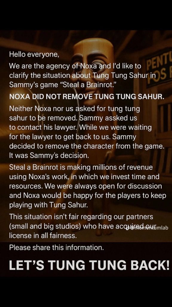 Belakangan, agensi Momentum Lab yang mewakili kreator aslinya, Noxaasht, memberikan klarifikasi. Mereka bilang Noxa nggak pernah minta penghapusan itu secara langsung, tapi developer Sammy yang menarik karakter tersebut karena lagi ada pembahasan soal lisensi. Mereka mengklaim Tung Tung adalah properti hak cipta, dan Steal A Brainrot udah menghasilkan jutaan tanpa izin resmi.