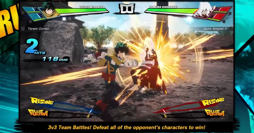 Game ini pun menawarkan pertarungan 3v3 dengan banyak karakter dari seri My Hero Academia baik hero maupun villain dalam versi mereka yang paling kuat. Pemain dapat memanfaatkan Quirks khas dan mekanik “Rising” yang meningkatkan kekuatan, kecepatan, dari Quirk mereka masing-masing.