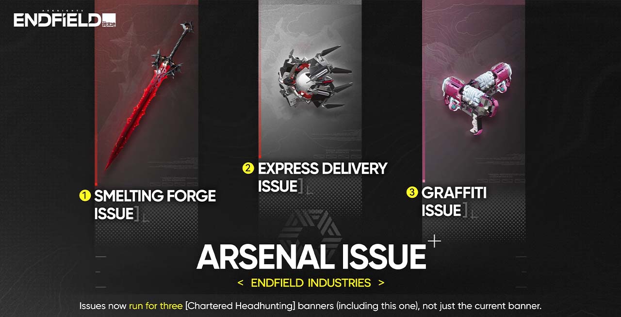 Pihak developer bahkan sudah menjawab feedback fans mengenai periode banner senjata, jadi semua senjata signature untuk masing-masing karakter Featured/Limited di Chartered Headhunting juga bisa diakses serempak selama satu periode panjang sebelum perilisan update besar selanjutnya. Para pemain yang rajin melakukan pull di Arsenal Issue juga akan diberi bonus reward berupa Arms Offering Crate di 10x Issue (100 pull), yang mana lewat crate ini kamu bisa bebas memilih senjata 6-Star (Non-Featured) untuk diklaim.