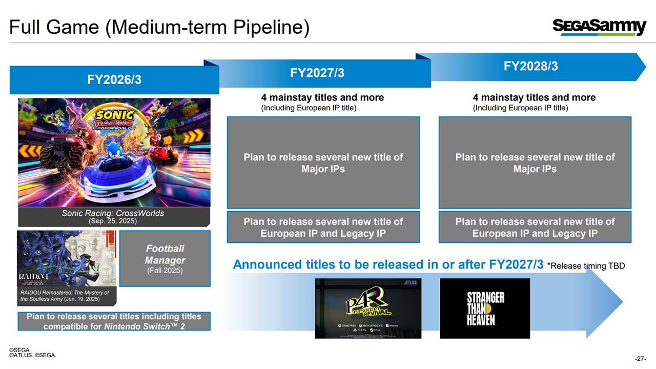Dengan konfirmasi tersebut bisa dipastikan kalau Persona 4 Revival masih butuh waktu lebih lama sebelum siap dirilis. Soal seberapa lama kita tentunya belum tahu, tapi setidaknya sudah ada laporan resmi dari presentasi SEGA SAMMY Management Meeting 2025 yang memberi gambaran lebih jelas. Laporan tersebut mencantumkan roadmap untuk beberapa game terbaru mereka, salah satunya adalah Persona 4 Revival yang direncanakan rilis pada FY2027/3 atau sesudahnya.