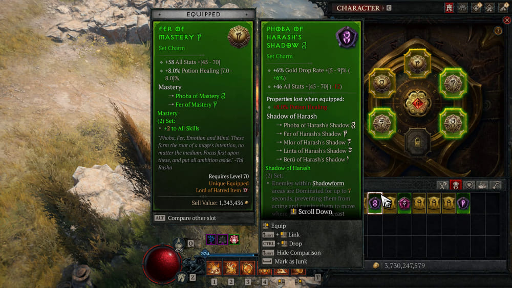 Sekilas mirip dengan sistem set di Diablo III, tapi implementasinya jauh lebih fleksibel. Pemain bisa menyesuaikan build sesuai kebutuhan tanpa harus terpaku pada satu set tertentu. Contohnya, kalau ingin fokus farming gold, tinggal pasang charms yang meningkatkan perolehan gold. Sistem ini simpel tapi efeknya terasa signifikan dalam jangka panjang.