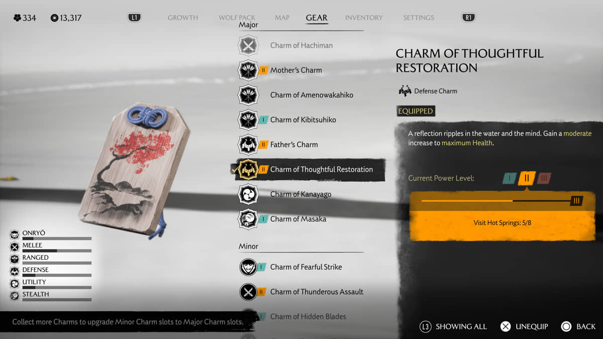 Charms juga punya level progresi. Misalnya ada charm yang bisa ningkatin HP maksimum, efeknya bisa diperkuat kalau kamu nemuin lebih banyak Hot Springs. Ada juga charm yang bikin efek Stagger makin kuat pas kamu berhasil parry musuh, dan buat ningkatin levelnya kamu harus sering-sering perfect parry. Biasanya charm punya tiga level sebelum maksimal, walau gak semua charm bisa di-upgrade.