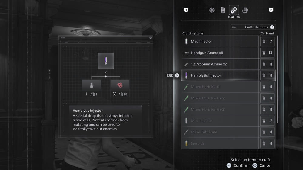 Setelah mendapatkan spesimen darah dan menyelesaikan puzzle pemodelan atom menggunakan mikroskop laser, ia membuka resep crafting. Dari sana, darah terinfeksi yang dikumpulkan lewat Blood Collector bisa digunakan untuk membuat peluru handgun dan revolver, item pemulihan, Molotov cocktail, botol asam, hingga Hemolytic Injector yang sangat kuat. Loop gameplay Grace lebih berfokus pada crafting dan konversi resource dibanding sekadar looting.