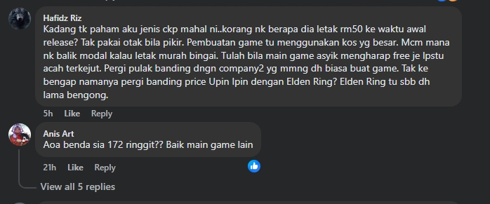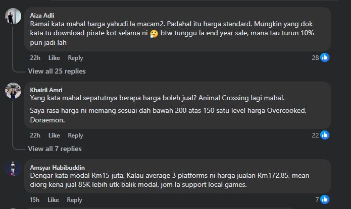 Meski tidak sedikit yang mengajukan komplain soal harga gamenya, ternyata ada juga sebagian yang memberi pembelaan. Ini apalagi bisa kami temukan lewat komentar dari para netizen Malaysia langsung yang juga memberi semacam perbedaan dengan kasus di game lain. Tentu saja alasan untuk mendukung produk lokal tidak diiyakan begitu saja oleh semua pihak, karena tidak sedikit juga mereka yang dari Malaysia mengharapkan penetapan standar lebih baik dan harga yang terefleksi dengan jelas sesuai kualitas.